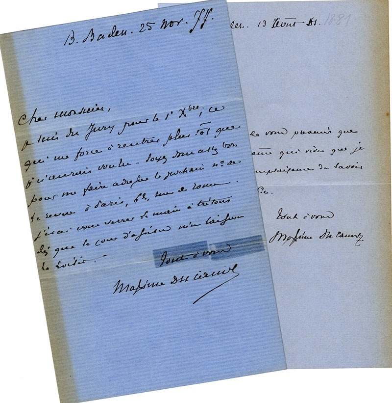 Ensemble de 2 lettres autographes signéesEnsemble de 2 lettres autographes signées. Baden-Baden, 1877 et 1881 ; chacune sur feuillet in-8°, l’une avec trace d’adhésif.25 novembre 1877 : « Je serai du jury pour le 1e Xbre ; ce qui me force à rentrer plus tôt que je...