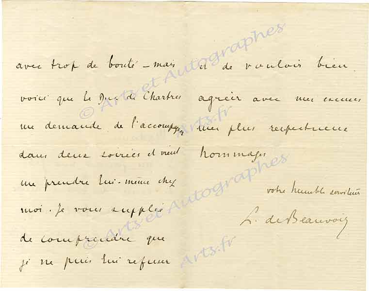 Lettre autographe signéeLettre autographe signée. Sans date ; 1 page in-8°. « Je me faisais une fête de venir de bonne heure sous votre toit où je suis toujours accueilli avec trop de bonté, mais voici que le Duc de Chartres me demande de l’accompagner...
