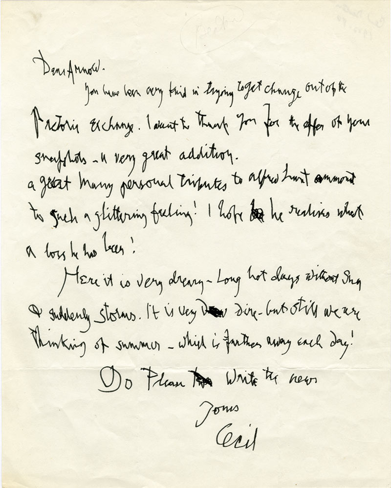 Lettre autographe signéeLettre autographe signée. Sans date ; 1 page in-4°.« You have beenvery kind in trying to get change out of the […] exchange. I want to thank you for the offer of your snapshots - a very great addition. A great many personal tributes...