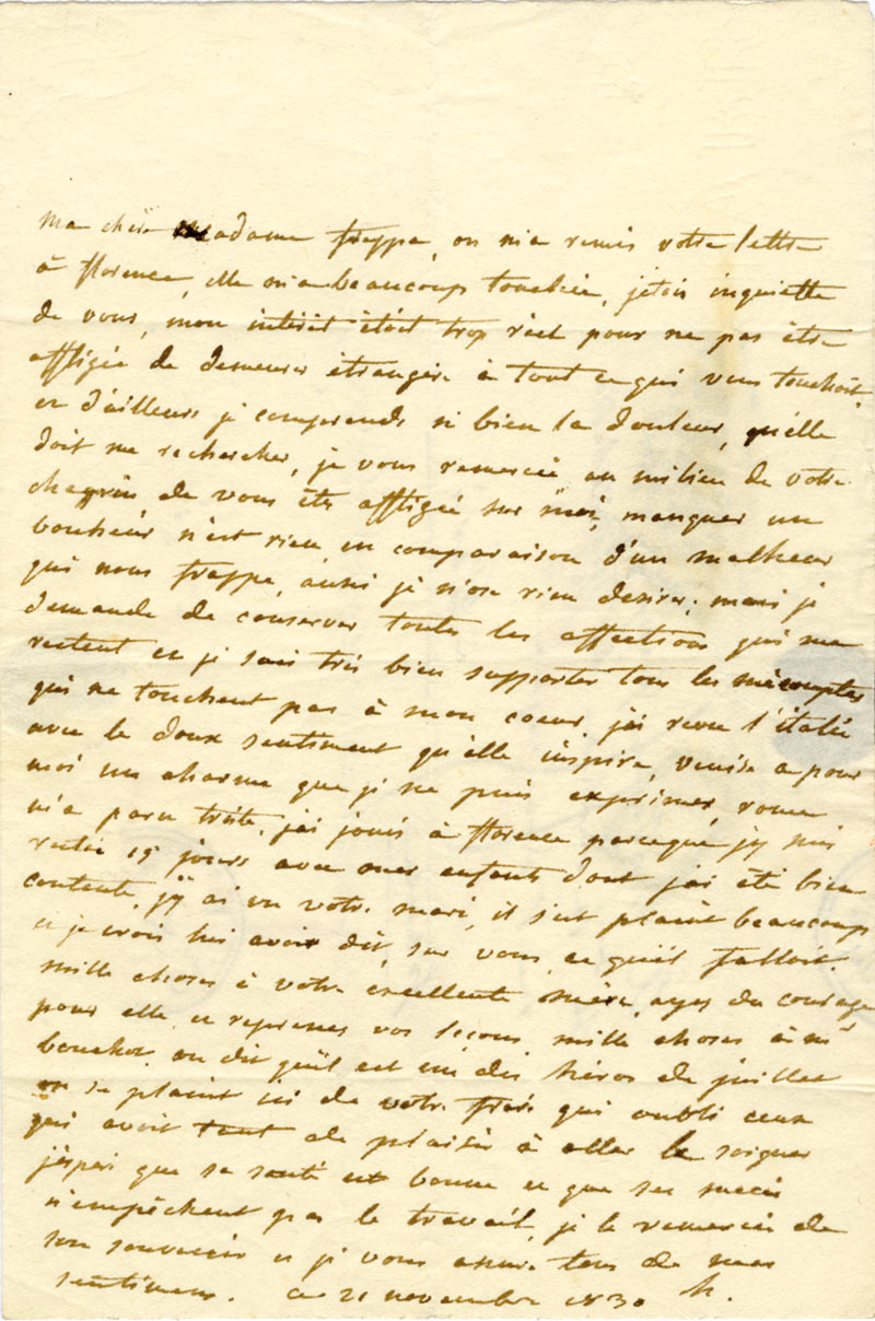 Lettre autographe signéeLettre autographe, signée « H », adressée à Mme Frappe chez la duchesse de Montebello. 21 novembre 1830 ; 1 page in-8°, adresse avec marques postales. « On m’a remis votre lettre à Florence, elle m’a beaucoup touchée,...