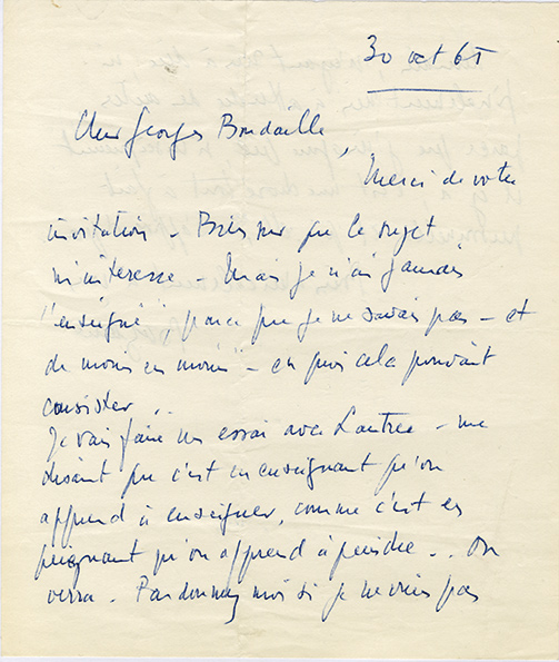 Lettre autographe signéeLettre autographe signée, adressée au critique dart Georges Boudaille. Toulon, 30 octobre 1965 ; 1 page 1/2 in-8°. « Merci de votre invitation. Bien sûr que le sujet mintéresse, mais je nai jamais enseigné, parce que je ne...