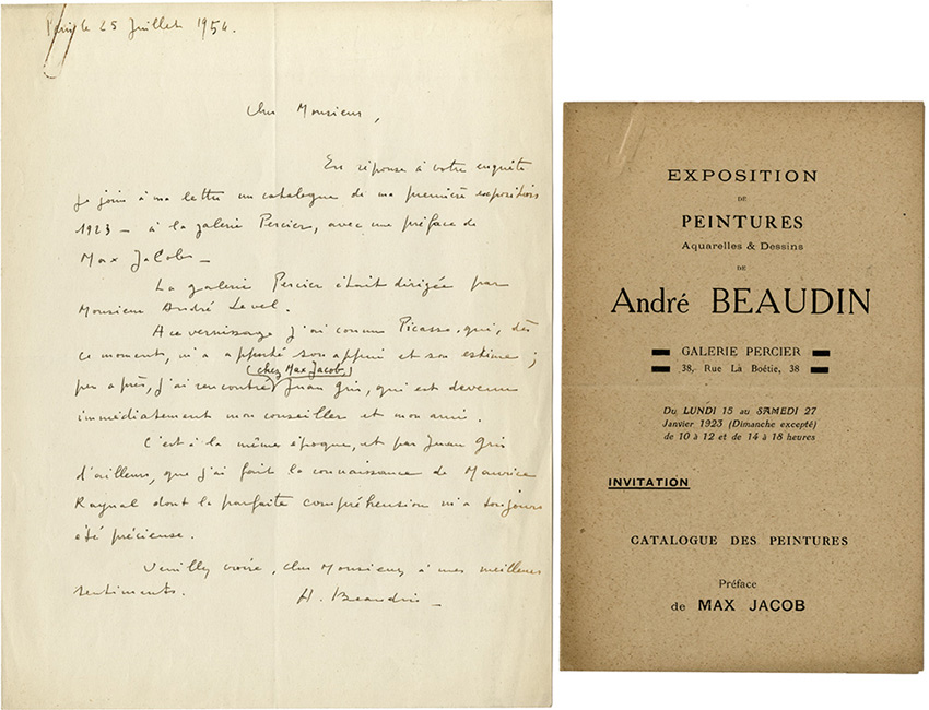 Lettre autographe signéeLettre autographe signée, adressée au critique dart Georges Boudaille. Paris 25 juillet 1954 ; 1 page in-4°. « En réponse à votre enquête je joins à ma lettre un catalogue de ma première exposition 1923 à la galerie Percier,...