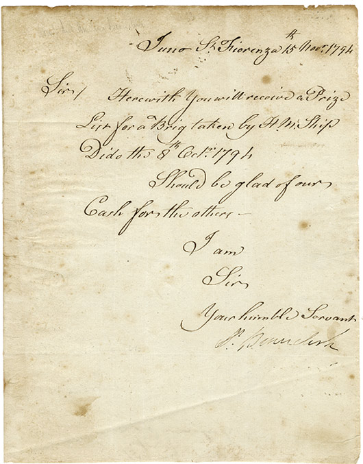 Lettre signéeLettre signée. Saint Fiorenza, le 15 novembre 1794 ; 1 page in-4° en anglais. ...