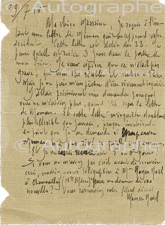 Lettre autographe signéeLettre autographe signée, adressée à sa marraine de guerre, Mme Fernand Dreyfus (la mère de Roland-Manuel). 29 juillet 1916 ; 1 page in-8°. Il a appris par sa mère que Mme Dreyfus avait eu un accident. Il l’espère rétablie mais se...