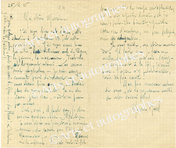 Lettre autographe signéeLettre autographe signée, adressée à sa marraine de guerre, Mme Fernand Dreyfus. 26 avril 1916 ; 2 pages in-8°.Belle lettre du front : « J’ai reçu hier vos lettres, celle acheminée à l’ambulance 13, et celle envoyée ici....