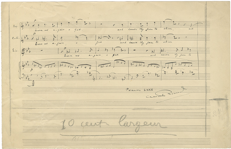 Manuscrit musical autographe signéManuscrit musical autographe signé. Circa 1928 ; 1 page oblongue (17,4 x 27 cm).Manuscrit d’une partie du Psaume LXXX op. 37.Manuscrit avec 10 portées, découpé d’une feuille plus grande, annotée au crayon par une autre main,...