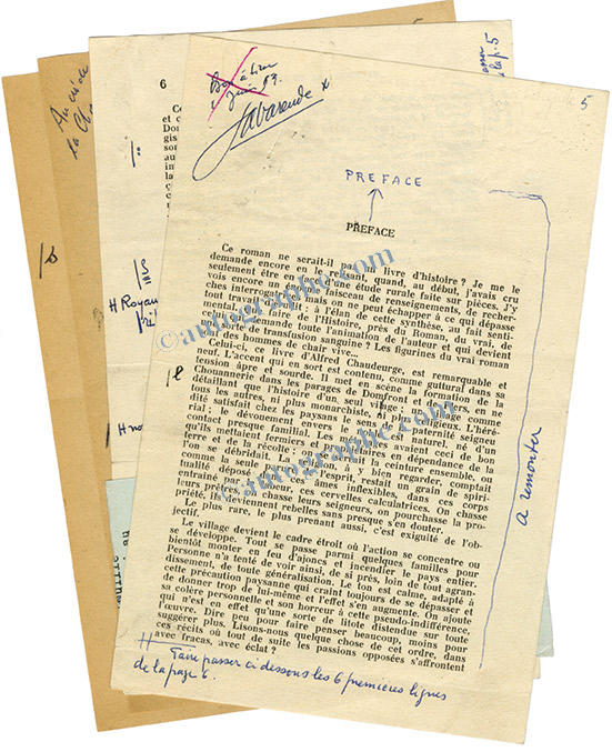 Épreuves corrigées et bon à tirerÉpreuves corrigées et bon à tirer de la préface qu’il avait rédigée dans l’ouvrage d’Alfred Chaudeurge Au Cri de la Chouette. 1er juin 1959 ; 4 pages in-8°. Une note de l’éditeur, imprimée à la fin de ce texte stipule :...