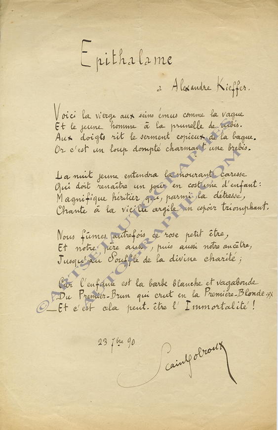 3 poèmes autographes3 poèmes autographes, dont 2 signés, 1887-1890 ; 4 pages petit in-4° et 1 page in-folio.— La Souffrance, sonnet irrégulier, est en deux versions : la première, datée 17 juin 1887, avec ratures et corrections, est biffée ; au...