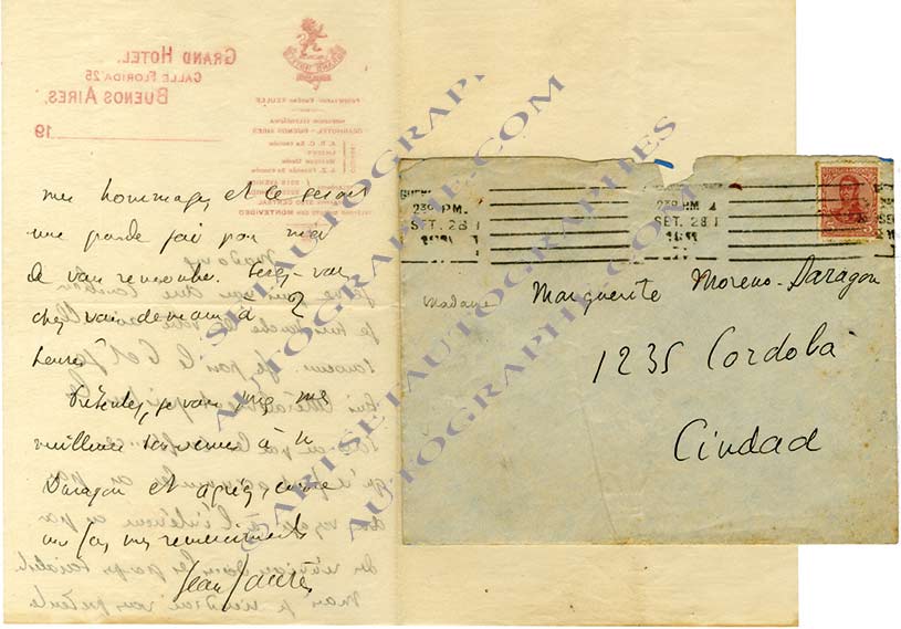 Lettre autographe signéeLettre autographe signée, adressée à Marguerite Moreno. Sans date [28 septembre] ; 2 pages in-8°. En-tête du Grand-Hôtel de Buenos Aires, enveloppe jointe avec adresse autographe.« Je ne puis vous dire combien je suis touché de...