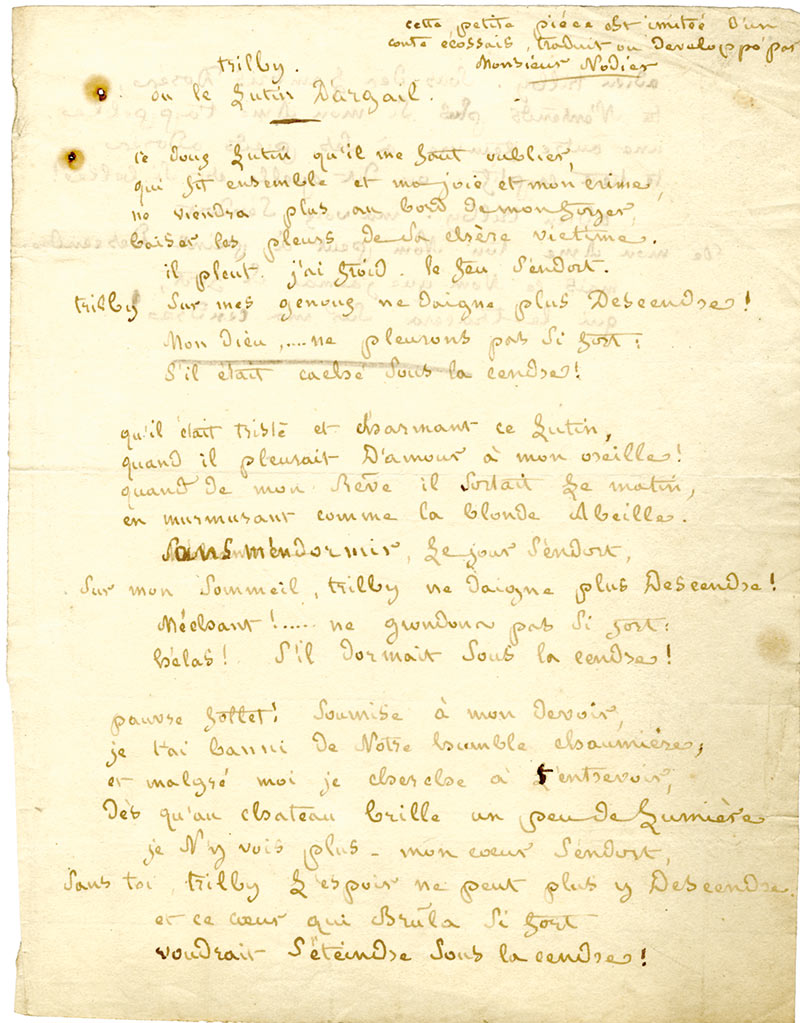 Poème autographe, intitulé « Trilby ou le Lutin d’Argail ».Poème autographe, intitulé « Trilby ou le Lutin d’Argail ». Sans date ; 1 page 1/4 in-4°. En haut du feuillet, Marceline Desbordes-Valmore a écrit : « Cette petite pièce est imitée d’un conte écossais, traduit ou développé...