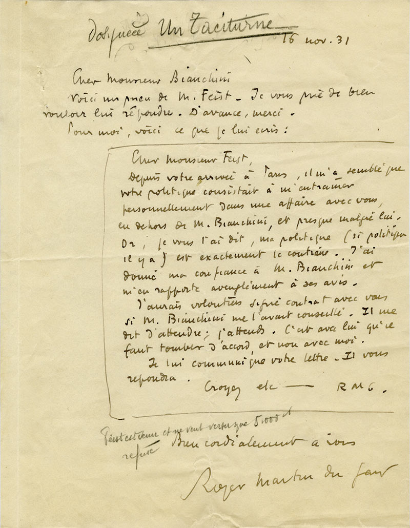16 piècesEnsemble de 16 pièces, dont 13 lettres autographes signées, concernant la pièce « Un Taciturne ». Adressées [très certainement, sauf mention différente] à Bianchini, agent général de la Société des Auteurs et Compositeurs...