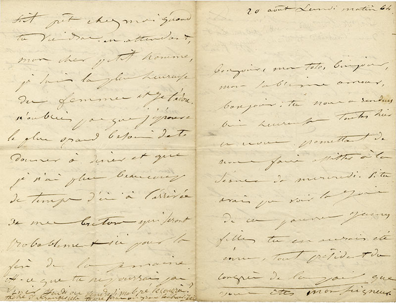 Lettre autographe signée «Juliette», adressée à Victor HugoLettre autographe signée « Juliette », adressée à Victor Hugo. Lundi matin 20 août [1849] ; 4 pages in-8°.Belle lettre d’amour : « Bonjour, mon Toto, bonjour, mon sublime amour, bonjour. Tu nous a rendues bien heureuses toutes...