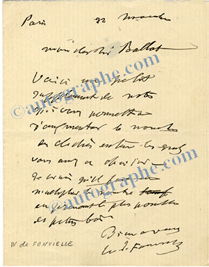 Lettre autographe signéeLettre autographe signée. 1/2 page in-12.« Lui voulez vous donner la peine de passer rue de La Tour d’Auvergne mercredi matin, vers dix heures. Vous me trouverez. Salut au brave sergent. »
