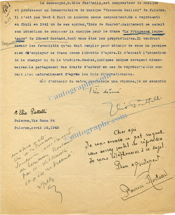Pièce signéePièce signée d’Elio Piattelli, avec 5 lignes autographes signées de Maurice Rostand. Palerme, 25 avril 1945 ; 1/2 page in-4°. « Le soussigné, M. Elio Piattelli, est compositeur de musique et professeur au conservatoire de musique...