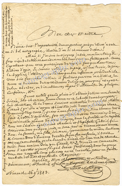 Lettre autographe signéeLettre autographe signée adressée à M. Villemain, académicien. Samedi matin, 1 page in-8°. « J’éprouve une vive satisfaction à vous annoncer la brillante victoire du chevalier [...] Sa [...] a été choisi à l’unanimité. Je...