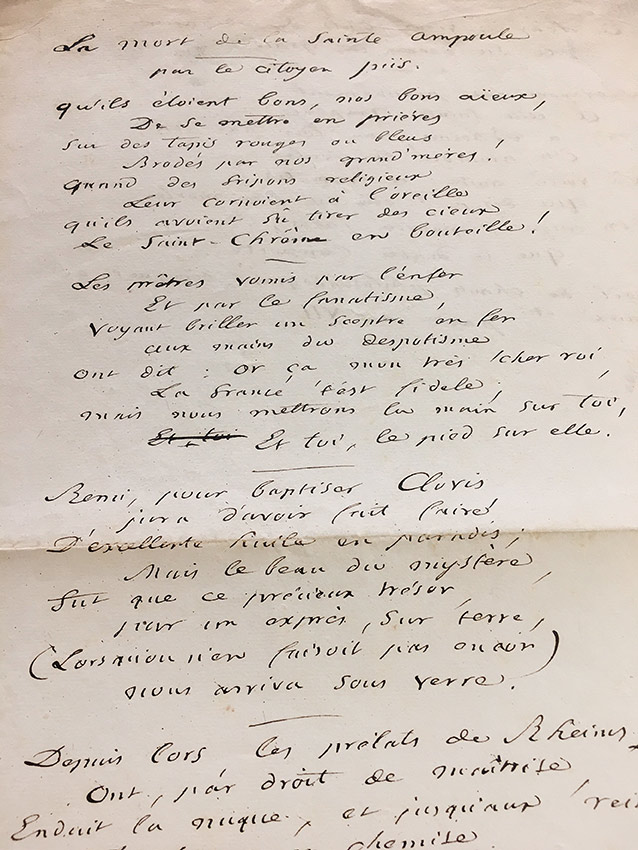 Manuscrit dépoque écrit dune autre main.Manuscrit d'époque écrit d'une autre main. « La mort de la Sainte Ampoule par le citoyen Piis ». 1 page in-folio. Extrait du « Recueil de chants philosophiques, civiques et moraux ». Paris, an VII.