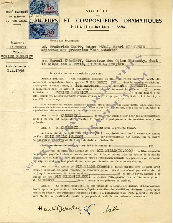 Pièce signéePièce signée. Paris, 18 mai 1953 ; 3 pages 1/2 in-4°. Traité signé entre Frederick Knott, Roger Feral et Henry Bernstein avec Marcel Karsenty (tous ont signé) pour représenter la pièce en 3 actes intitulée Crime parfait avec un...