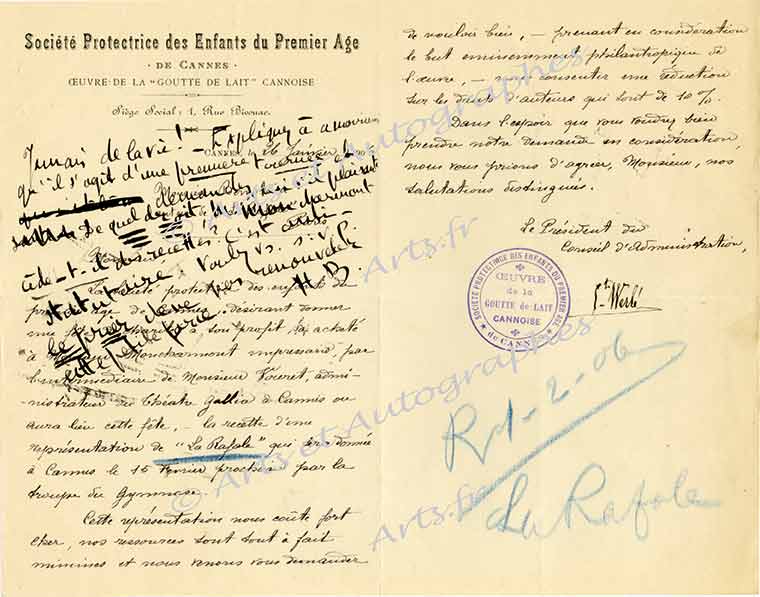 Pièce autographe signéePièce autographe signée sur une lettre à lui adressée par une femme et qu’il renvoie à la Société des auteurs. 26 janvier 1906 ; 1 page 1/2 in-8°. En-tête « Société protectrice des Enfants du Premier Âge ». Sur une...