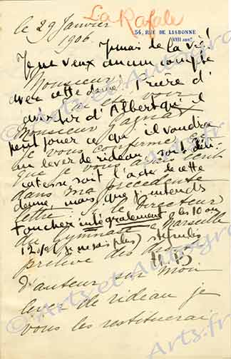 Pièce autographe signéePièce autographe signée sur une lettre à lui adressée par une femme et qu’il renvoie à la Société des auteurs. 29 janvier 1906 ; 1 page 1/2 in-8°. Sur sa pièce La Rafale. Mme Marie Rodocanachi lui écrit : « Je vous confirme ce...