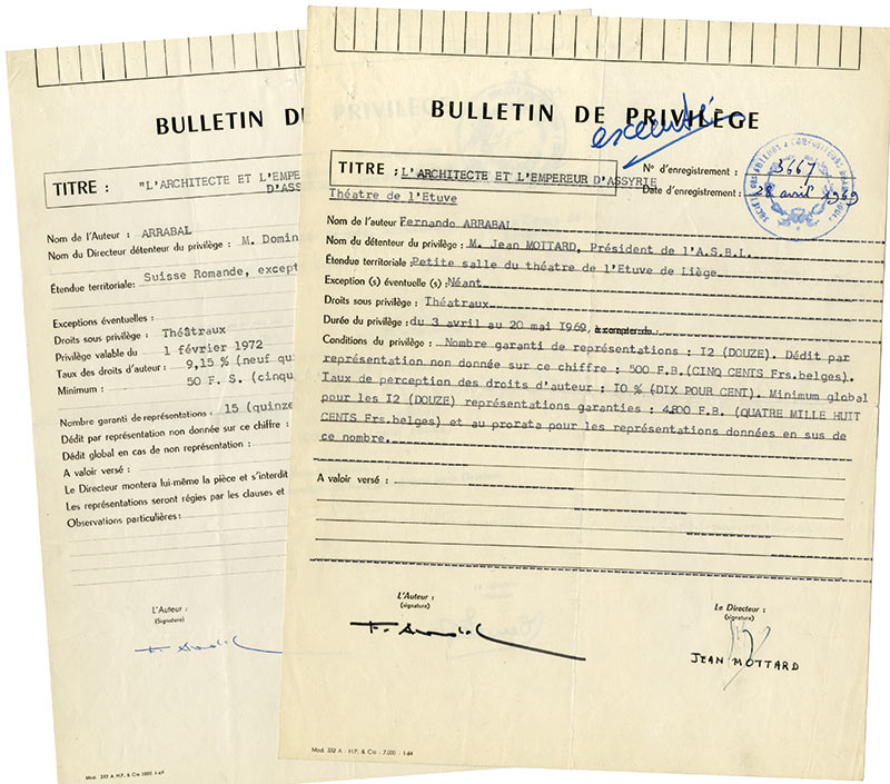 Ensemble de 2 pièces signées.Ensemble de 2 pièces signées. Bulletins de privilèges signés pour la pièce L’Architecte et l’Empereur d’Assyrie l’un en faveur de M. Domingos Semedo, directeur des Trois Coups de Lausanne et l’autre en faveur de Jean Mottard,...