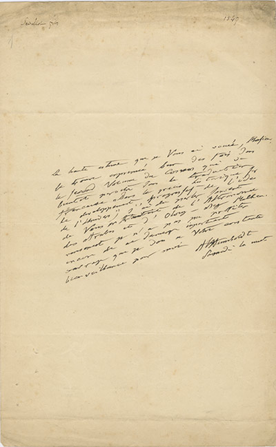 Lettre autographe signéeLettre autographe signée, adressée à une femme. 18 janvier 1867 ; 1 page in-8°. « Je vous remercie de votre bon souvenir et je prends note de vos réunions du samedi, mais comme le plus tôt c'est le mieux, je me réserve d'abord pour...