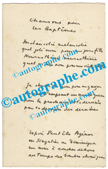 Poème autographe signéPoème autographe signé « Chansons pour les baptêmes ». [1946] ; 1 page 1/2 in-8°. Publié par l’éditeur Eynard (Suisse), en 1949, dans un recueil intitulé Chansons.« Chansons pour les baptêmesMélancolie mélancoliequel...