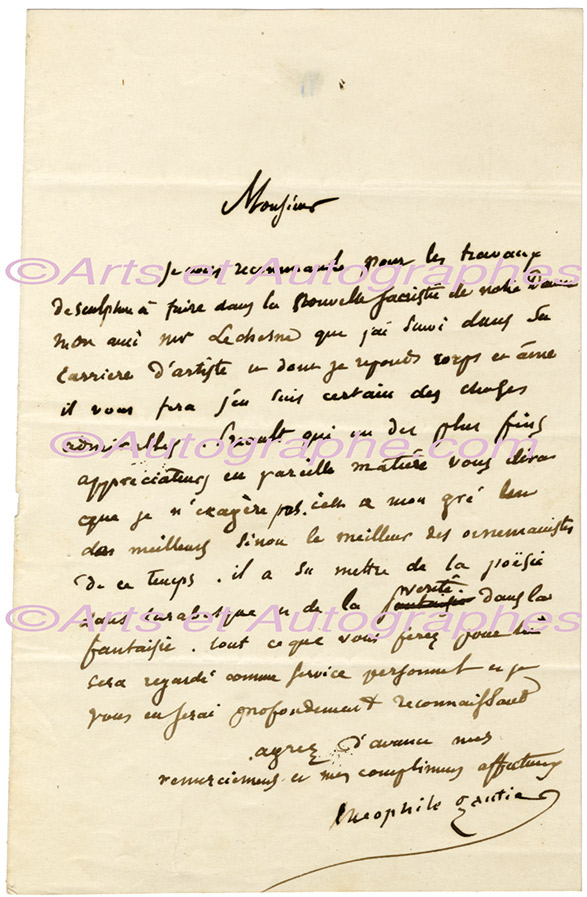 Lettre autographe signéeLettre autographe signée, adressée à l’architecte Jean-Baptiste-Antoine Lassus. Sans date [vers 1846-1847] ; 1 page in-8°. Chaleureuse lettre de recommandation en faveur de son ami le sculpteur Auguste Lechesne [1819-1888]. « Je...