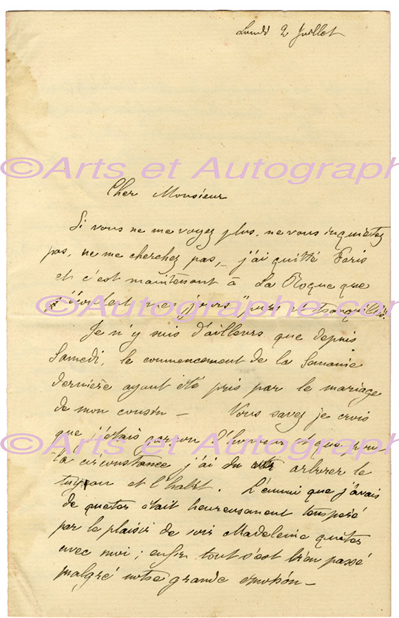 Lettre autographe signéeLettre autographe signée, adressée à Élie Allegret. [La Roque,] « Lundi 2 juillet » ; 2 pages 1/2 in-8°. Il a quitté Paris, après le mariage de son cousin et s’est installé à La Roque. « Vous savez, je crois, que j’était...