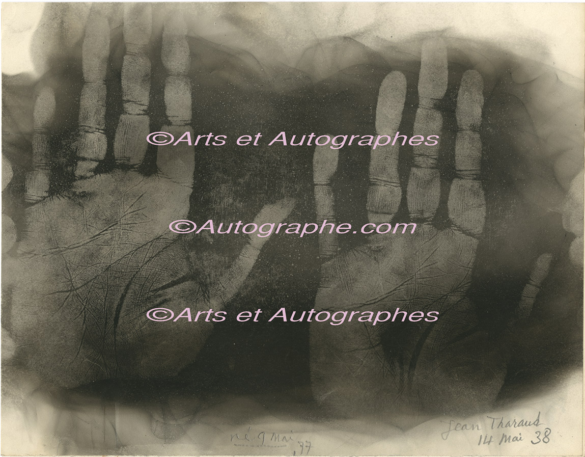 Empreintes des mains gauches des frères Jérôme et Jean TharaudEmpreintes des mains gauches des frères Jérôme et Jean Tharaud réalisées le 4 mai 1938, sur une feuille de papier noircie à la fumée et ayant servi à la réalisation du livre La Main de l’écrivain, publié chez Stock.