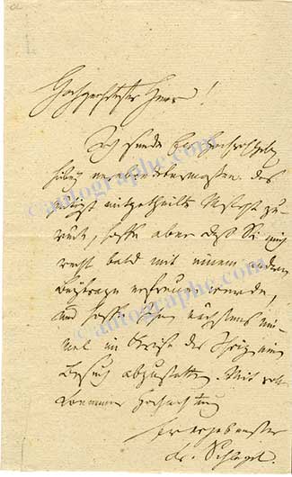 Lettre autographe signéeLettre autographe signée, adressée à J.B. Bupprecht. [vers 1812-1813 ?] ; 1 page in-8° ; en allemand. Il lui renvoie «le manuscrit que vous aviez eu la bonté de me transmettre, tout en espérant que, très bientôt, je pourrai me...