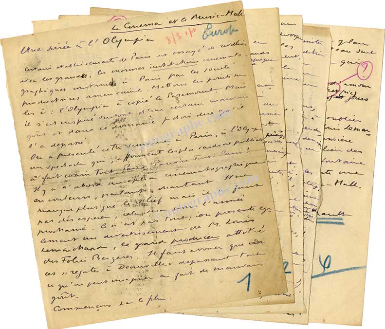 Manuscrit autographe signéManuscrit autographe signé, Le Cinéma — Music-Hall : Une Soirée à l’Olympia. [Vers 1930] ; 5 pages in-4°. Amusant compte rendu, pour L’Europe nouvelle, du spectacle qui fait courir tout Paris : un opéra cinématographique en...