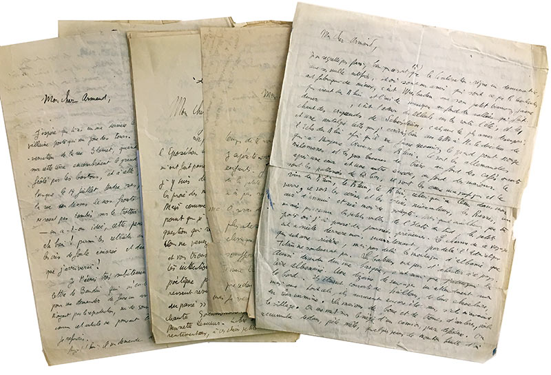 Ensemble de 8 lettres autographes signées, adressées à Armand SalacrouEnsemble de 8 lettres autographes signées, adressées à Armand Salacrou. Sans date ; 19 pages in-4°, quelques pages effrangées en bordure. Très intéressante correspondance entre les deux écrivains.— « Je ne regrette pas Paris,...