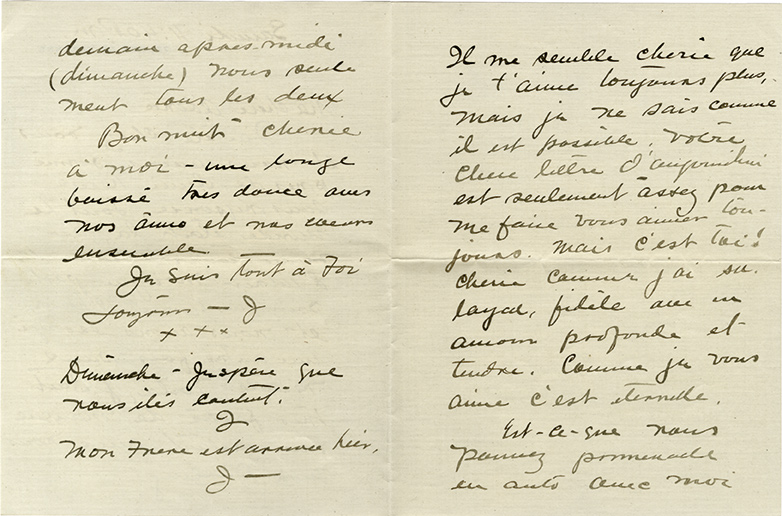 Lettre autographe signée « J. », adressée à Micheline RescoLettre autographe signée « J. », adressée à Micheline Resco. 15 pages formats divers, quelques enveloppes ; en français.Extraordinaire lettre damour accompagnée des clefs pour des communications chiffrées, adressées à sa...