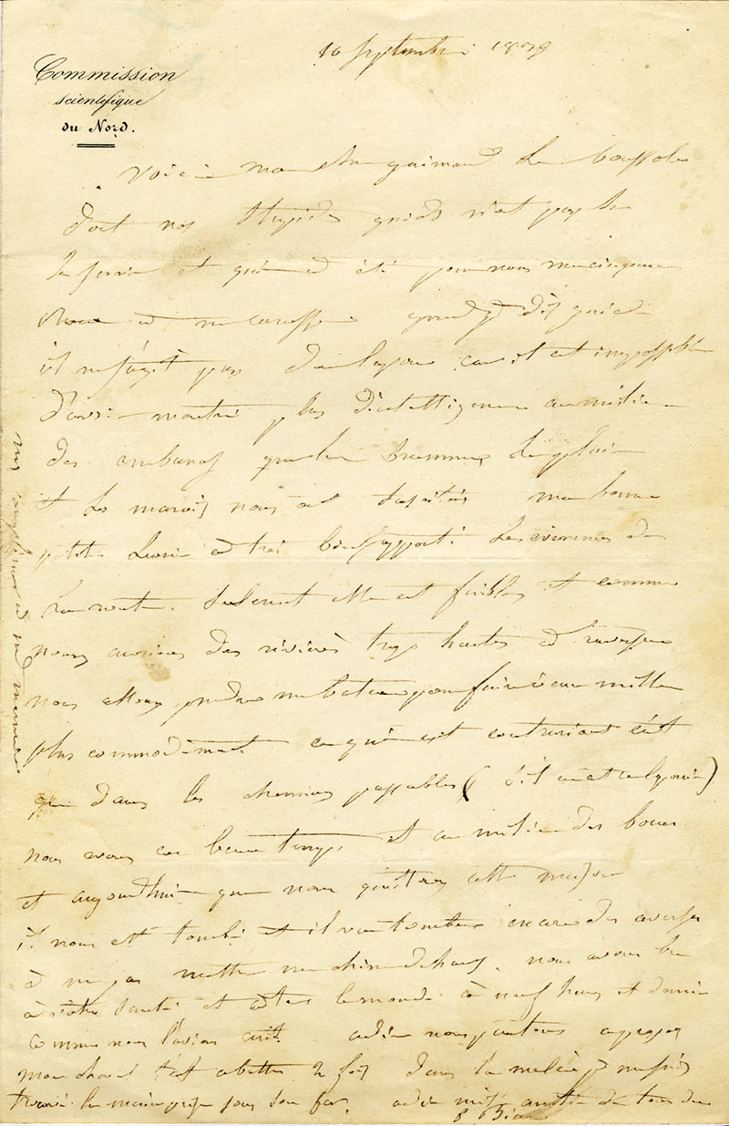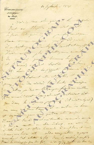 Lettre autographe signéeLettre autographe signée, adressée à M. Gaimard. 10 septembre 1839 ; 1 page in-8°. En-tête imprimé « Commission scientifique du Nord ». Amusante lettre sur un voyage et sa confrontation aux intempéries. Il y est question d’une...