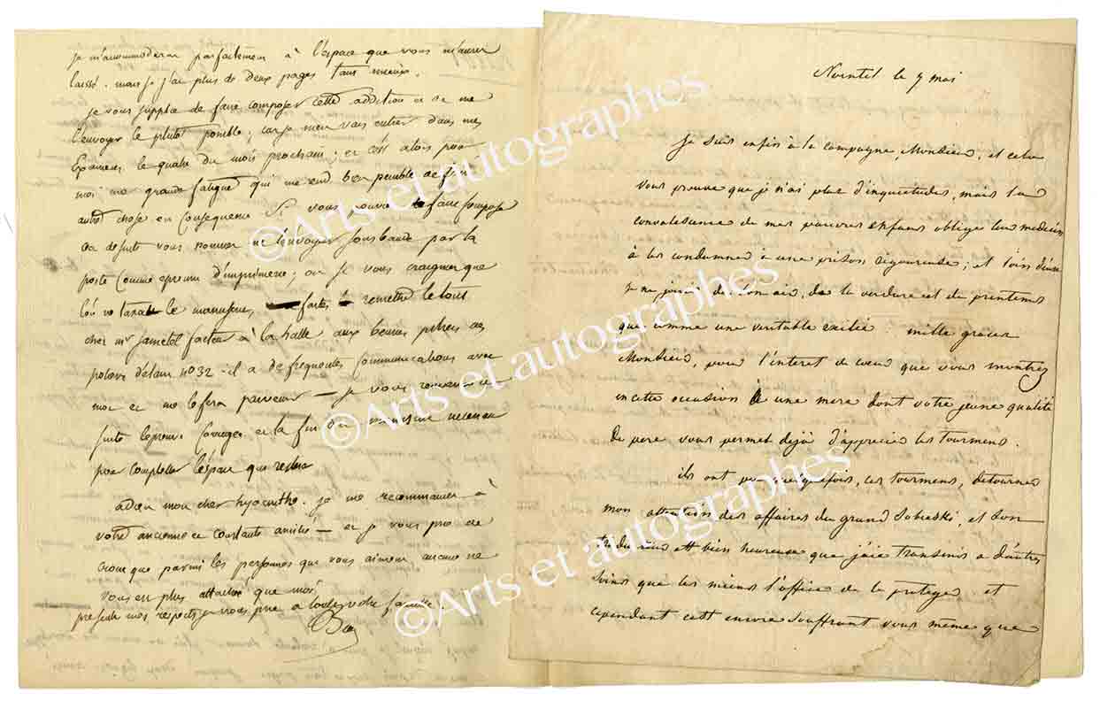 Lettre autographe signéeLettre autographe signée. Nointel, par Clermont , le 19 juillet 1828 ; 2 pages in-4°. « Je vous adresse par une voie sûre, la plus grande partie du manuscrit nécessaire pour remplir les neuf pages et demie que vous avez eu la...