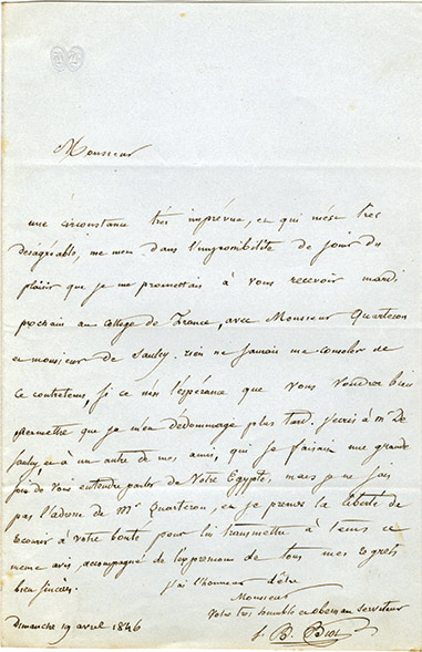 Lettre autographe signéeLettre autographe signée. 19 avril 1846 ; 1 page in-8°. « Une circonstance très imprévue, et qui mest très désagréable, me met dans limpossibilité de jouir du plaisir que je me promettais à vous recevoir mardi prochain au...