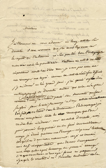 Lettre autographe signéeLettre autographe signée, adressée à M. Michaux. Sans date ; 1 page 1/2 in-12 avec adresse. Il lui envoie un article sur Descartes et demande à revoir l'épreuve car le copiste ne connait pas bien l'orthographe. « J'ai gardé des...