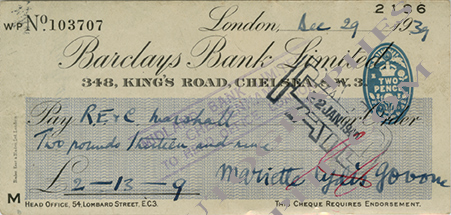 Chèque autographe signéChèque autographe signé. 29 décembre 1939 ; 1 page in-16 oblongue. Chèque sur la banque Barclays pour Simpsons Piccadilly. 3 lignes autographes signées.