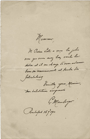 Lettre autographe signéeLettre autographe signée. Paris, 30 décembre 1916 ; 2 pages in-8°. « Merci Monsieur, d’avoir parlé de mon livre en des termes charmants, mais je vous supplie de ne pas y croire : 1° que j’ai décidé d’être un fabricant. 2°...
