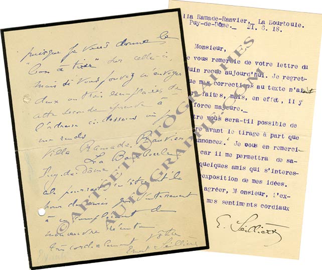 Ensemble d’1 lettre autographe signée et 1 lettre signéeEnsemble d’1 lettre autographe signée et 1 lettre signée (1918).On joint une lettre de sa femme et le discours de réception à l’Académie française (1946) ainsi qu’une photographie.