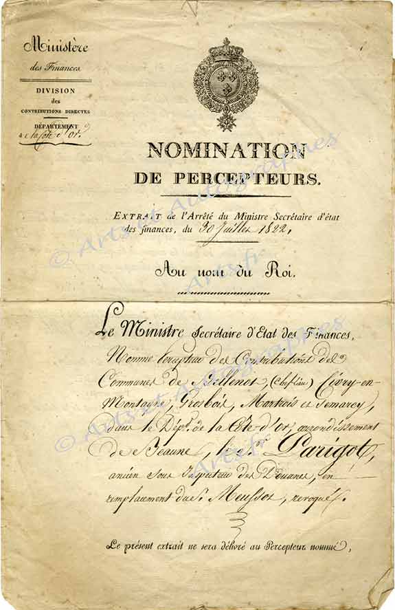 Nomination de percepteursPièce émanant du Ministère des Finances. Paris, 30 juillet 1822 ; 2 pages in-folio. En-tête du ministère des Finances et vignette aux armes royales : « Nomination de percepteurs ». Avis de nomination de M. Parigot au poste de...