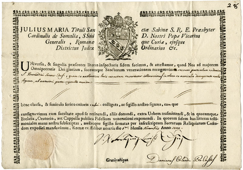 Pièce signéePièce signée. 6 novembre 1800 ; 21,5 x 30,5 cm. Beau décor avec les armes épiscopales encadrant son nom en latin. Sceau aux armes sur papier en bas à gauche. Texte en latin.Diplome de lettres universitaires délivré à S. Bernardini.
