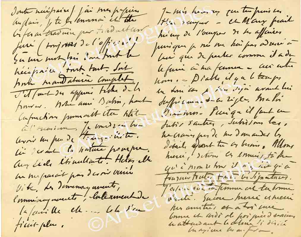 Lettre autographe signéeLettre autographe signée, adressée à son ami Jean Bénier. Hammamet (Tunisie), [6 août 1947] ; 6 pages in-8° avec enveloppe. Il donne de tristes nouvelles de ses proches, une de ses petites-filles est morte à l’âge de 13 mois, son...
