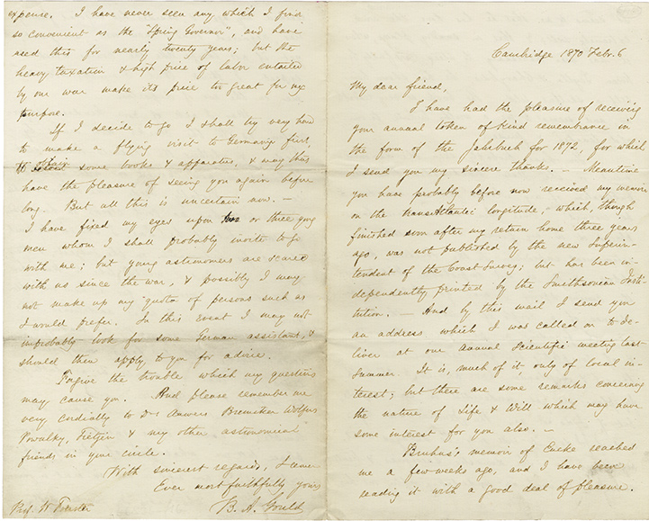 Lettre autographe signéeLettre autographe signée, adressée au Pr Foerster. Cambridge, 6 février 1870 ; 4 pages in-8°. « Meantime you have probably before now received my memoire on the transatlantic longitude, which, though finished soon after my return home...