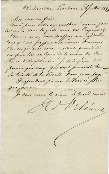 Lettre signée.Lettre autographe signée. Wood Norton, Evesham 26 juillet 1886 ; 1 page in-8°. Il a été condamné par la seconde loi dexil : « Comme ami vous souffrez avec moi du coup qui me frappe ; moi, comme Français, jen rougis avec vous,...