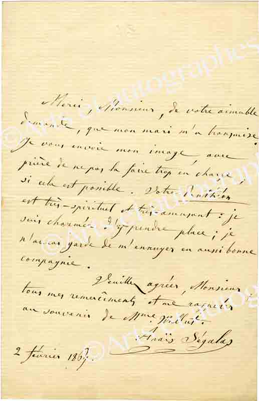 Lettre autographe signéeLettre autographe signée, adressée à Charles Wallut. 2 février 1867 ; 1 page in-8°.« Merci, Monsieur, de votre aimable demande, que mon mari m’a transmise. Je vous envoie mon image, avec prière de ne pas la faire trop en charge,...