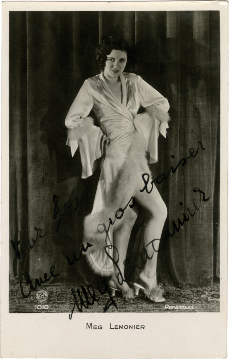 Photographie dédicacéePhotographie dédicacée. 14 x 9 cm.« Pour Jane avec un gros baiser, Meg Lemonnier. »
