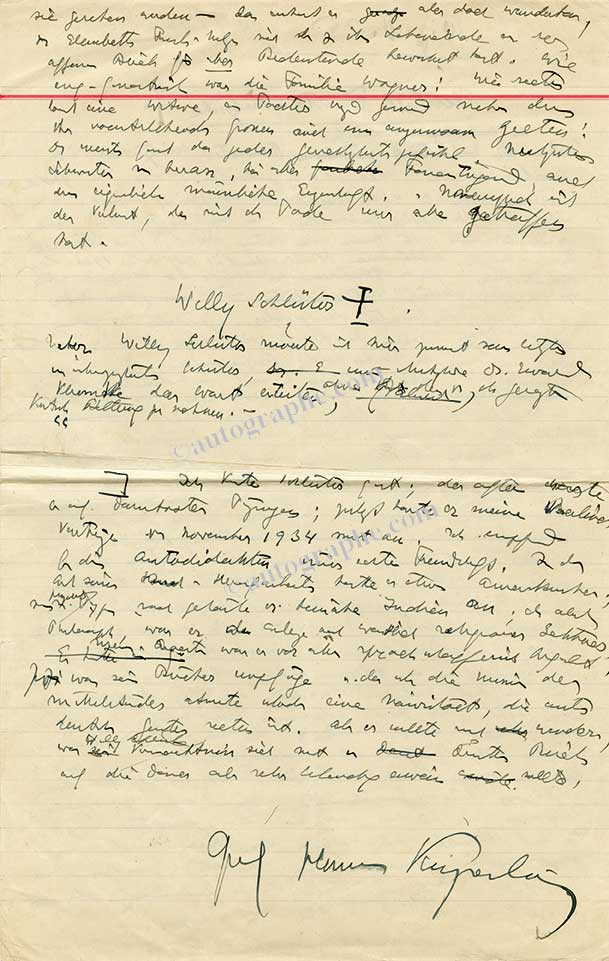 Manuscrit autographe signéManuscrit autographe signé, intitulé « Elisabeth Foerster-Nietzsche ». 1925 ; 6 pages in-folio, avec corrections ; en allemand. Manuscrit concernant la mort de la sœur de Nietzsche et de Willy Schlütes, Zaratohustra de Nietzsche,...