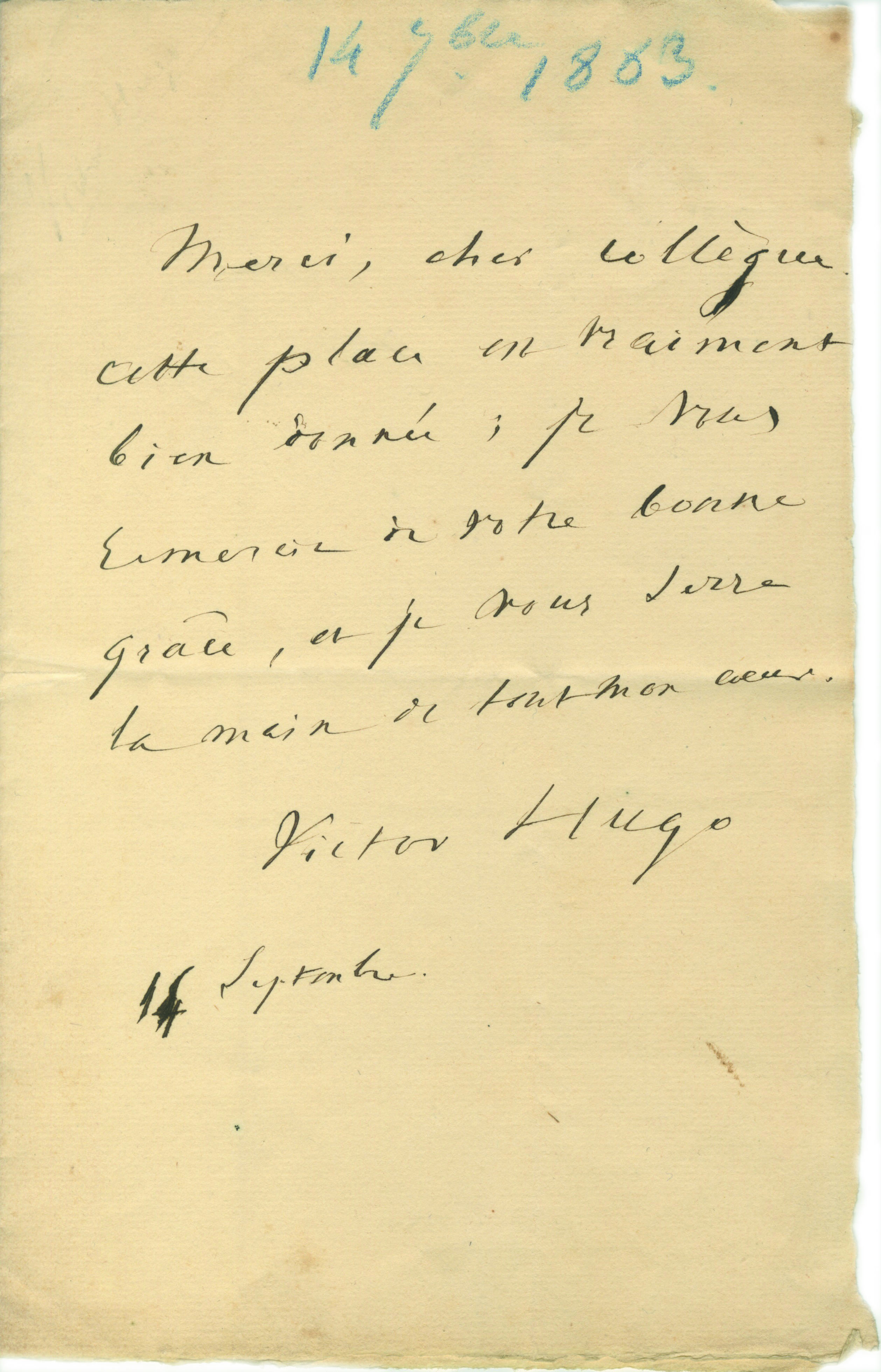 lettre autographe signéeLettre autographe signée adressée à un collègue. 14 septembre 1883 ; 1 page in-4°. ...