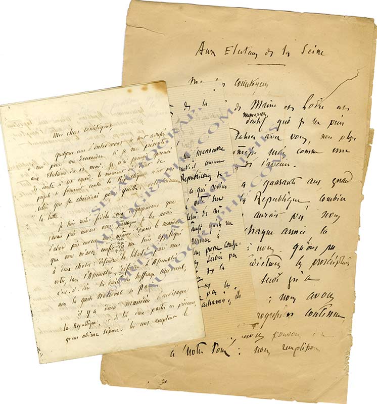Ensemble de 3 manuscrits autographesEnsemble de 3 manuscrits autographes (dont un signé et un incomplet), d’adresses aux électeurs. 9 pages in-folio in-8° (un feuillet effrangé).Belles proclamations républicaines. — Paris, 6 mai 1849, à ses concitoyens : «...